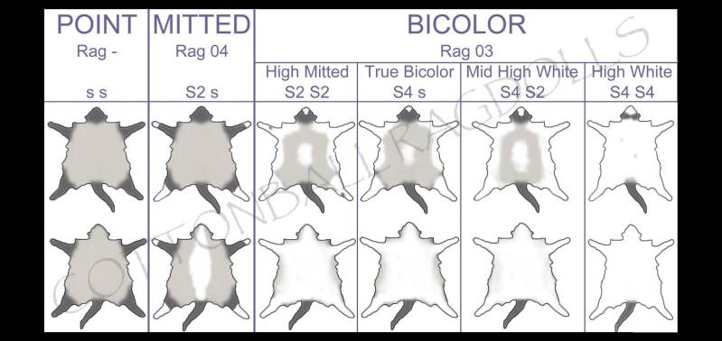 | Colorpoint | Mitted | High-Mitted | Bicolor | Mid High-White | High-White | |