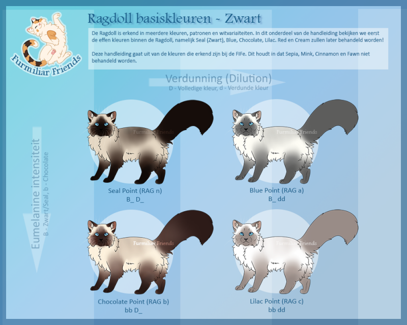 Hieronder worden de kleuren en aftekeningen van de Ragdoll verder uitgelegd.